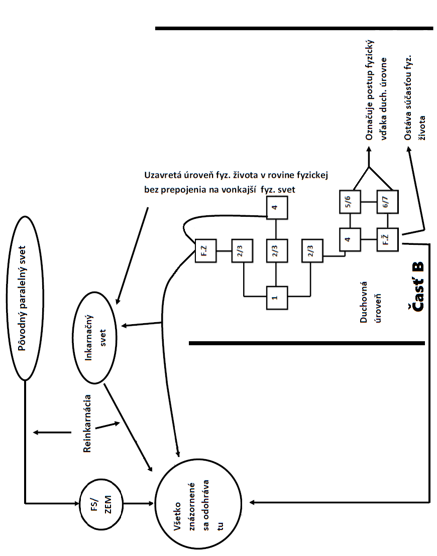 V hornej a ľavej časti je znázornené, ako Duša prichádza napríklad z Pôvodného paralelného sveta (znázornený v elipse hore) sem na Zem. Deje sa to samozrejme cestou narodenia do fyzického tela a inkarnovaním Duše. Vľavo som to znázornil v dvoch kružniciach a to FS/ZEM a s popisom „Všetko znázornené sa odohráva tu“.